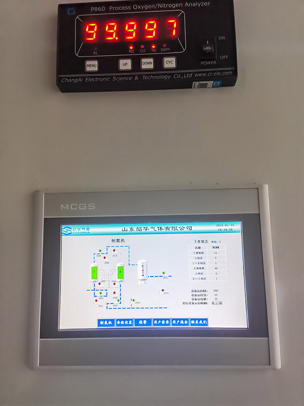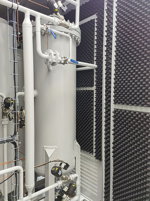 给客户推荐使用制氮机现场制气,经过与客户反复讨论,决定利用现有空压机的富余气量。现有空压机建设工厂时选型过大,有1/3的压缩空气余量,经过详细的计算,根据富余气量及压力给客户配套相应型号的制氮机,纯度99.99%。设置液氮切换系统,一旦制氮机有异常故障,瞬时切换到液氮气站管路供气。
