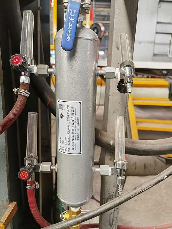 采用集中供气的供应模式,新建氩气站,采用20m³的低温储罐,利用现有的CO2储罐改造,安装德国威特的混配器进行现场混配,车间内安装集中供气管路,下垂管路末端加装气包,气包采用四个分支接头,即插即用。
